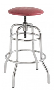 Banqueta sem encosto com assento estofado, giratória com rosca, que possibilita regulagem de altura, de 69cm a 81cm.
